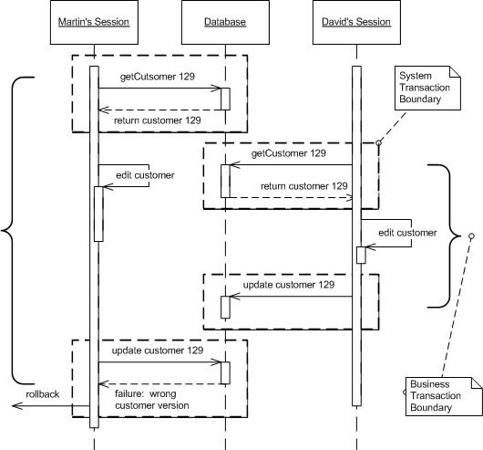 ビジネストランザクションはしばしば一連のシステムトランザクションを跨いで実行される。一旦、ある1つのシステムトランザクションから抜けると、ビジネストランザクションがレコードデータを整合性を保持した状態で格納されていることを保証するのにデータベースマネージャ単体では任せられない。一旦2つのセッションが同じレコードに対して処理を始め、更新されたデータを紛失することがありえるのであれば、データの一貫性は危険に瀕している。また、あるセッションが別のセッションが読み込み中のデータを修正すると一貫しないデータが読まれることがありそうだ。